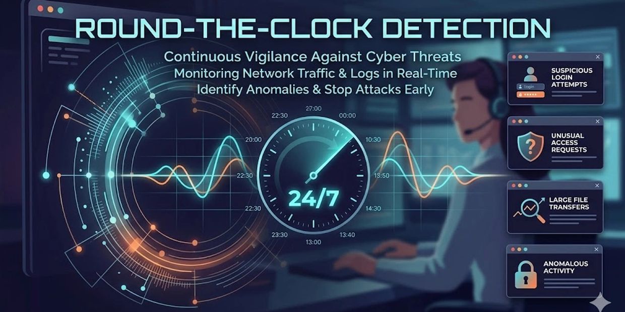 Cyber threats don't stick to business hours, and neither do we. By analyzing traffic patterns and log data in real-time, our security experts spot red flags—like suspicious logins or massive data exports—the moment they happen. We stop intruders at the door, preventing minor anomalies from becoming major security disasters.